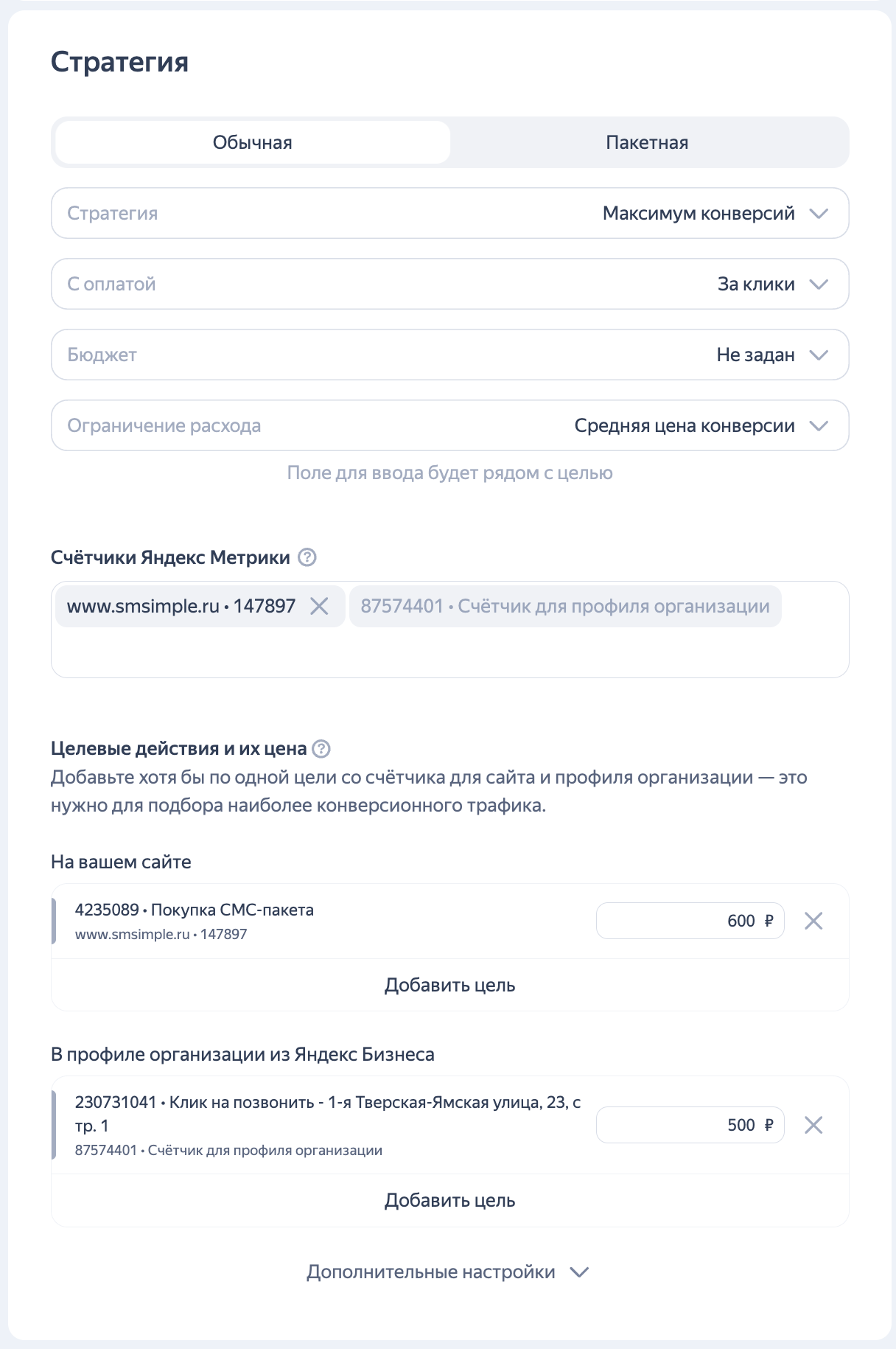 Настройте стратегию и цели. Для более эффективного продвижения в Картах добавьте цели с сайта и цели счетчика для профиля организации. Этот счетчик создается автоматически для карточки организации и фиксирует такие действия пользователя в карточке, как клик по кнопке «Позвонить», клик по кнопке «Построить маршрут», переход в мессенджер и другие.