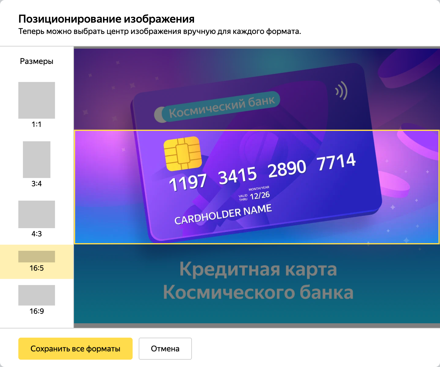 В Директе вы можете настроить для каждого формата изображения смарт-центр — главную по смыслу область, которая не будет потеряна при автоматической обрезке.