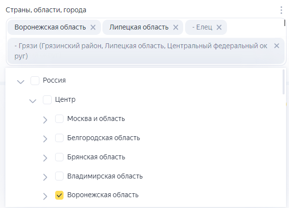 Начните вводить название, перейдите к дереву выбора регионов и отметьте регионы для показа объявлений. Установив флажок рядом с регионом, вы выбираете его целиком, включая все входящие в него населенные пункты (даже если они не указаны отдельно в дереве регионов).