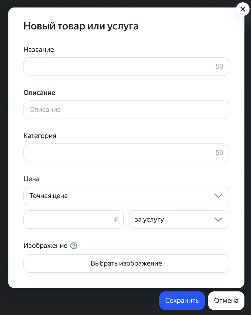 Добавьте параметры товара/услуги: название, описание, категорию, тип и значение цены, изображение.