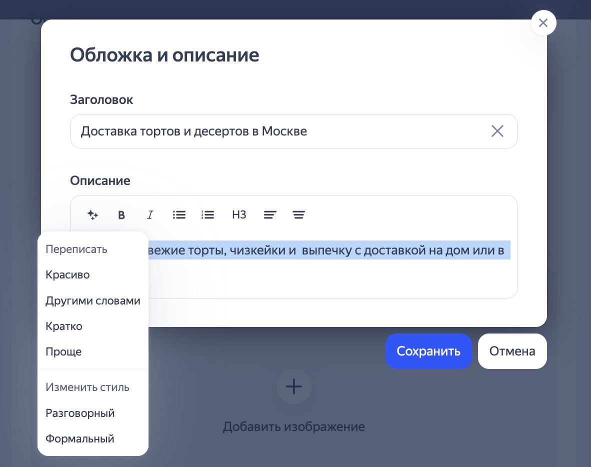 Оформите описание, например выделите текст жирным или курсивом, добавьте список или заголовок. Можно переформулировать текст с помощью нейроредактора, для этого выделите текст, нажмите значок