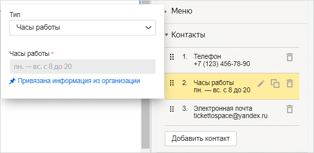 Если в Яндекс Бизнесе указано несколько телефонов, на Турбо-страницу добавляется только первый из списка. Таким же образом добавляются все остальные данные об организации. Телефон и электронную почту можно изменить в конструкторе вручную.