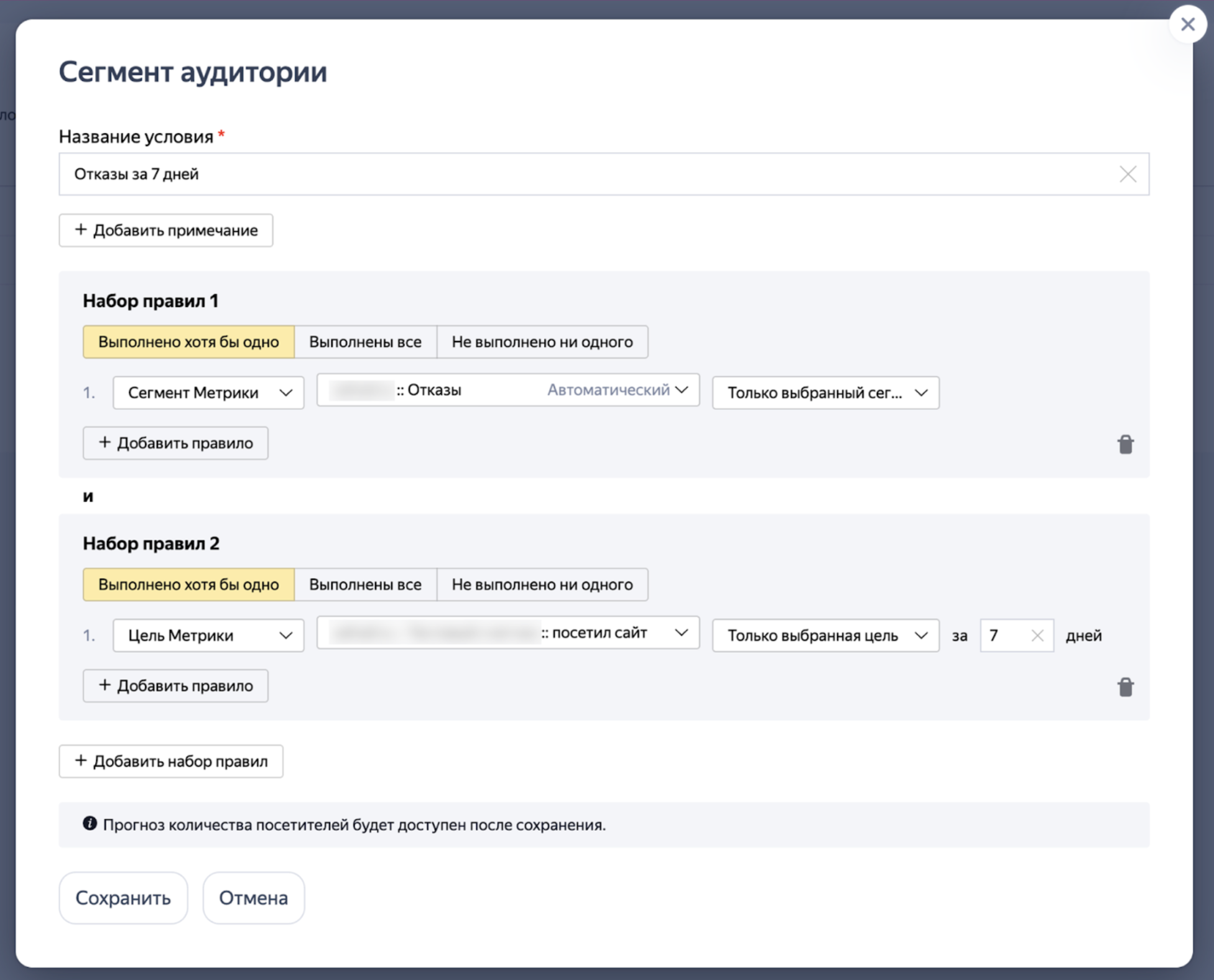Условие формирования сегмента аудитории может состоять из одного или нескольких наборов правил (не более 50), объединенных оператором «И».