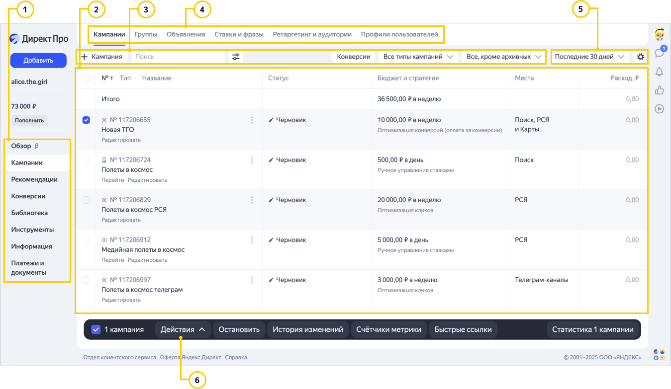Все данные по вашим кампаниям, группам и объявлениям представлены в одном окне. Основные элементы показаны на рисунке.