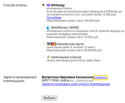 Если ранее вы оплачивали счета от имени физического лица, то для смены плательщика на странице Выписать счет нажмите изменить способ оплаты или плательщика. На странице Выбор способа оплаты счета измените данные текущего плательщика или зарегистрируйте нового. Нажмите на кнопку Выбрать. Счет будет выставлен на нового плательщика.