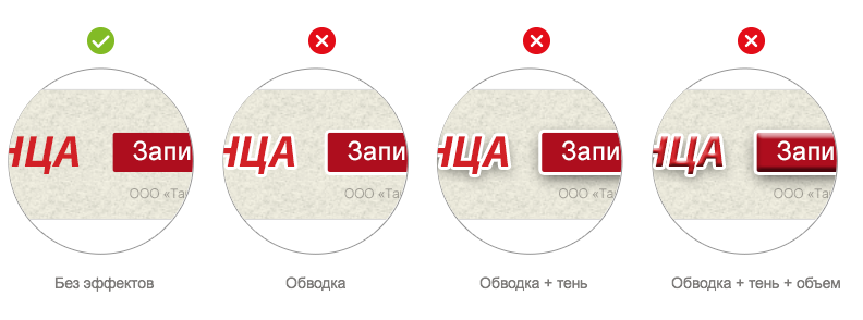 Украшательство шрифтов и плашек (тень, обводка, объем) может усложнить восприятие сообщения.