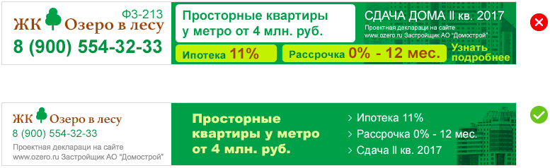 Не пытайтесь вместить большое количество информации на узкий баннер. Придумайте короткую и понятную формулировку, чтобы сообщение считывалось моментально.
