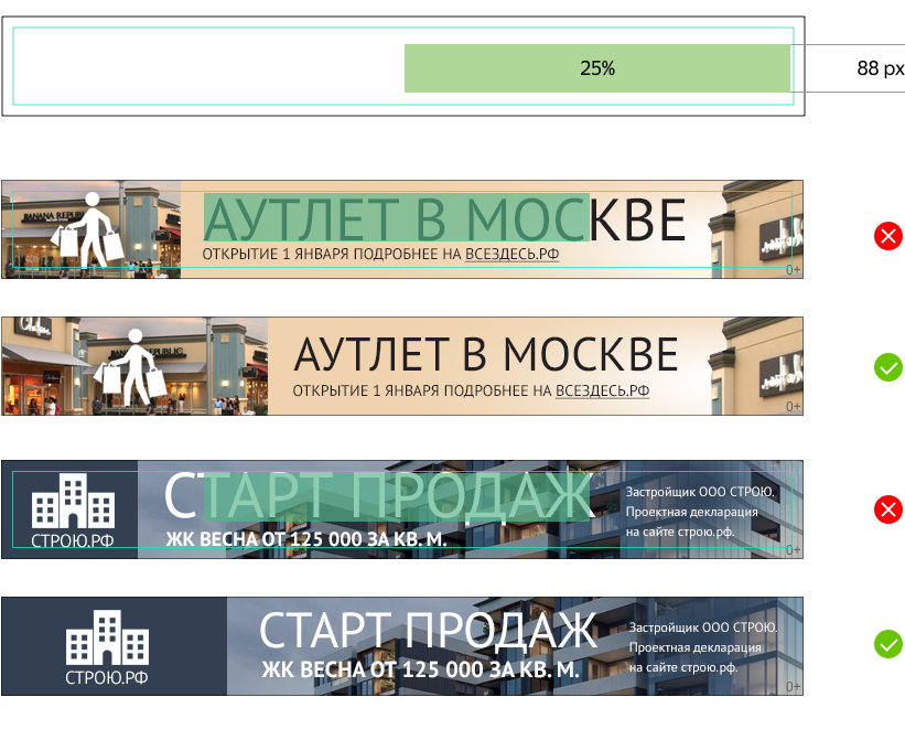 • 88 пикселей, если текст занимает не больше 25% баннера;