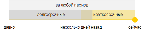 Для каждого набора необходимо указать тип интересов: долгосрочные (интересуются регулярно), краткосрочные (интересовались в течение последних дней) или за любой период. Краткосрочные интересы обновляются в режиме реального времени, долгосрочные — раз в сутки.