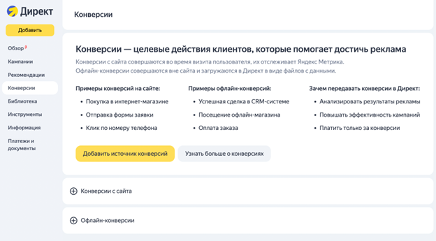 Перейдите на страницу Конверсии и нажмите Добавить источник конверсий.