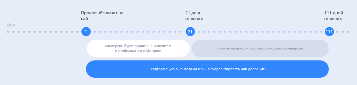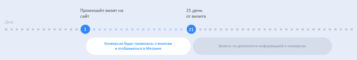 Окно атрибуции, в течении которого можно привязать конверсию к визиту, составляет 21 день. Это значит, что визит не дополнится информацией о конверсии, если она совершена позже 21 дня с последнего визита на сайт.