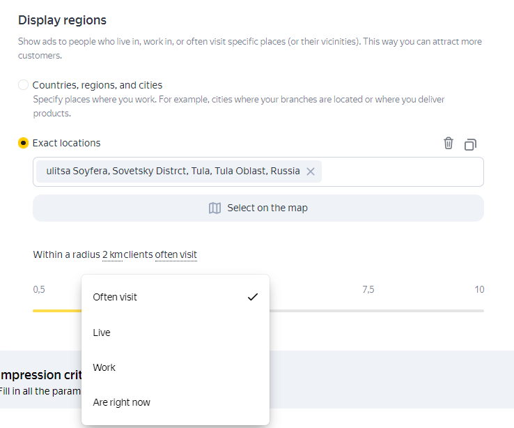 Reklamları belirli bir yerde, örneğin kafenizin yakınında göstermek istiyorsanız veya dar bir alandaki müşterilerle ilgileniyorsanız, haritada bölge belirtin. Örneğin, tüm şehre teslimat yapmayan küçük bir işletmeniz var. Ayrıca, yerleşim yeriniz bölge ağacında yoksa Haritada bölge belirtin seçeneğini tercih etmek daha iyidir. Haritada bölgeleri seçerken, gösterim coğrafyasını çok daraltma ve potansiyel müşterileri kaybetme riski taşıdığınızı unutmayın.