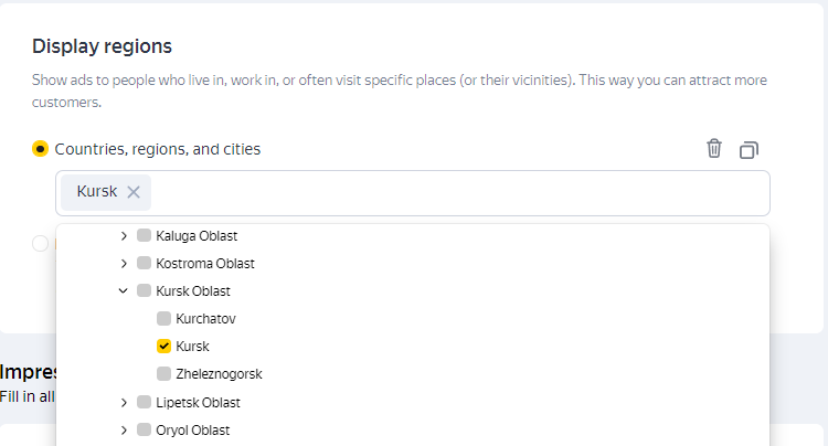 1. Adı yazmaya başlayın, bölge seçimi ağacına gidin ve reklamların gösterileceği bölgeleri işaretleyin. Bölgenin yanındaki kutuyu işaretleyerek, içindeki tüm yerleşim yerlerini (bölge ağacında ayrı olarak belirtilmemiş olsalar bile) tümüyle seçmiş olursunuz.