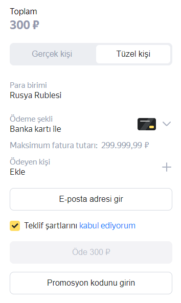 1. Menüde Yükle düğmesine basın. Açılan pencerede ödeme tutarını girin, Diğer ödeme yöntemleri seçin ve Bakiye yükle düğmesine basın.