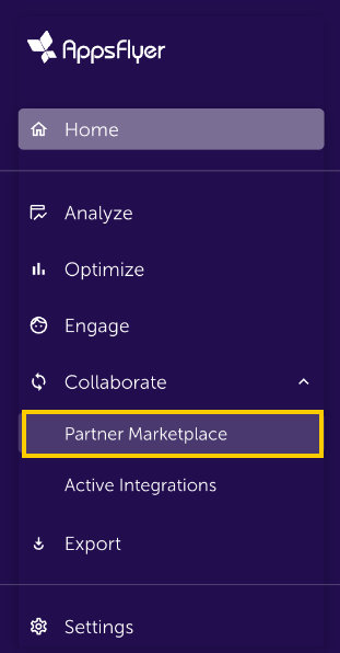 AppsFlyer arayüzünde menüden Collaborate → Partner Marketplace seçin.