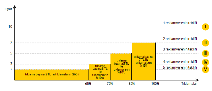 İkinci reklamveren, tıklama başına 5 lira fiyatla kendisi için mümkün olan maksimum trafiğin %85’ini alacak.