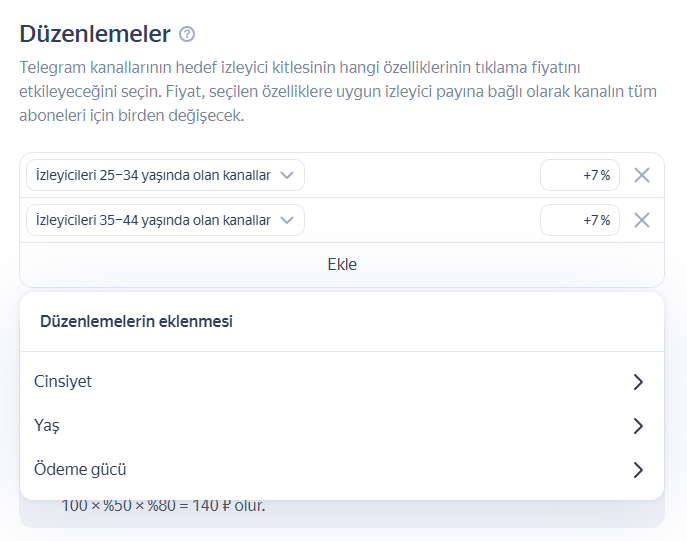 Tıklama fiyatının 100 ₽ olduğunu düşünelim. Hedef kitlesi erkekler olan Telegram kanalları için tıklama fiyatını %50 artırmak istediğinizi varsayalım. Tıklama başına fiyat bu oran baz alınarak hesaplanır: