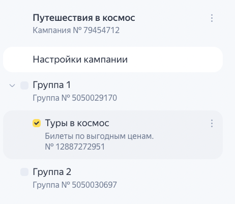 Kampanya, uzman tanıtımı oluşturulduktan sonra Yandex Direct’te Yandex Hizmetler’de görünür. Tanıtım parametrelerini görüntülemek veya düzenlemek yalnızca Yandex Hizmetler’deki uzman panelinde mümkündür. Yandex Direct’te yalnızca bu tür kampanyaların listesini ve harcanan tutarı görebilirsiniz.