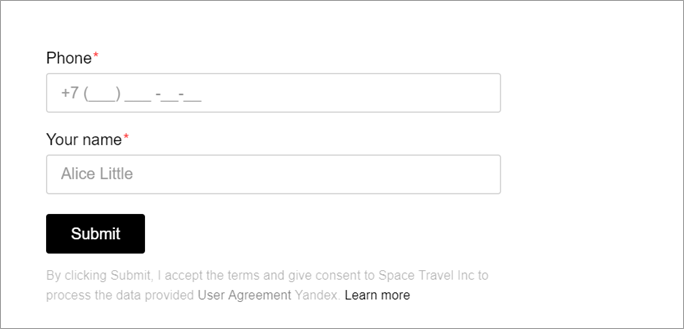 填写 Legal information 部分。 在通过表单收集客户个人数据时,您必须指明有关您自己或您所在组织的信息,这些信息将插入到表单下方的消息中。 选择业务结构(个人或法律实体)并在此部分填写信息。 如果需要,请添加完整版用户协议链接。 当您点击 Learn more 标签时,它将以弹窗形式显示。