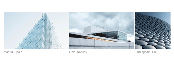 在 Gallery 部分,您可以使用一系列含简要说明的图像传达产品消息。 您可以使用自创图像、库图像或之前使用的图像。 产品廊可在页面上同时展示多个图像,而且支持水平滚动。 支持的纵横比为 16:9 和 1:1。 您可以在同一产品廊中使用多种不同的纵横比。