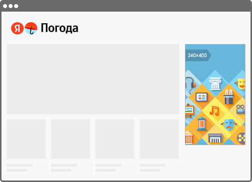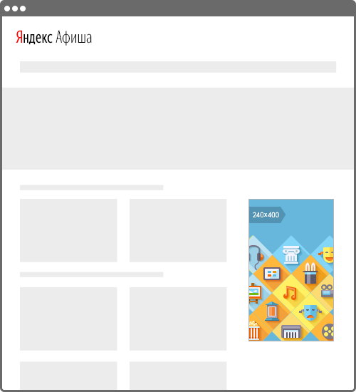 显示格式的横幅投放在 Yandex 服务的智能电视、桌面和移动版本中,例如 Yandex Video、Yandex Images、Yandex Music、Kinopoisk、Yandex TV Program、Auto.ru、Lessy 等以及 YAN 合作伙伴网站上。 广告牌被投放在服务页面的顶部中,占据整个屏幕宽度。