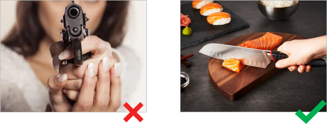 法律禁止或限制宣传的商品和服务(武器、酒精、毒品和精神药物、烟草制品、吸烟用具、赌博等)。 例外情况:可以在游戏广告中使用类似武器构造的产品图像。 例如,在游戏广告中使用武器的绘图。 这些图像不得包含暴力场景,包括瞄准用户的镜头。