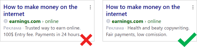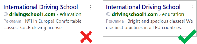 不要使用没有指定您所宣传的产品或服务的通用关键字(例如,购买、公寓_或_折扣)。 使用与您的广告主题直接关联的关键词代替它们:购买折扣汽车座椅、_购买莫斯科市中心的公寓_等等。