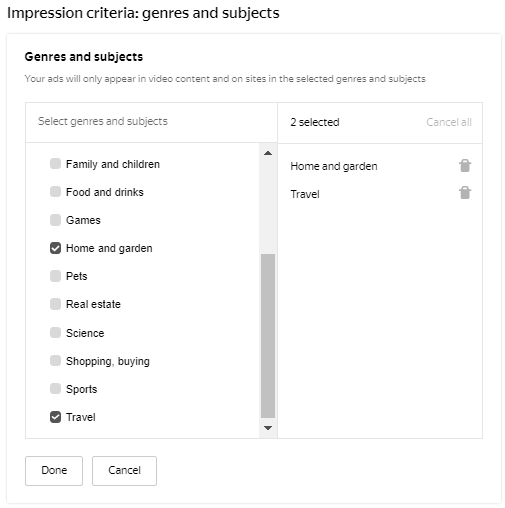在创建广告组时,您可以按体裁和主题启用展示。 在 Impression criteria 下,点击 Genres and subjects,然后选择相关定向。
