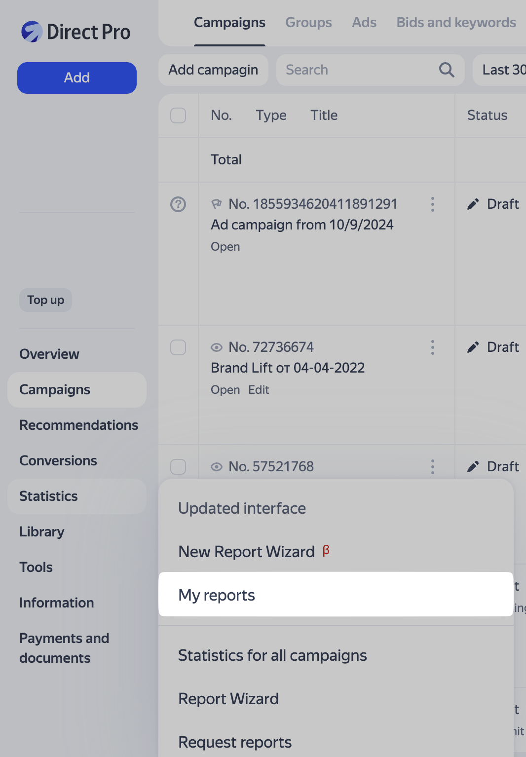 您可以在Yandex Direct Pro侧边栏菜单的Statistics栏目下找到该功能。