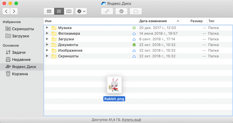Откройте папку Диска в Finder и скопируйте в нее нужные файлы. При такой загрузке файл хранится и на компьютере в папке Яндекс Диска, и в облаке Яндекс Диска.