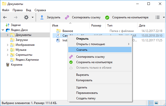В контекстном меню файла или папки выберите Скачать.