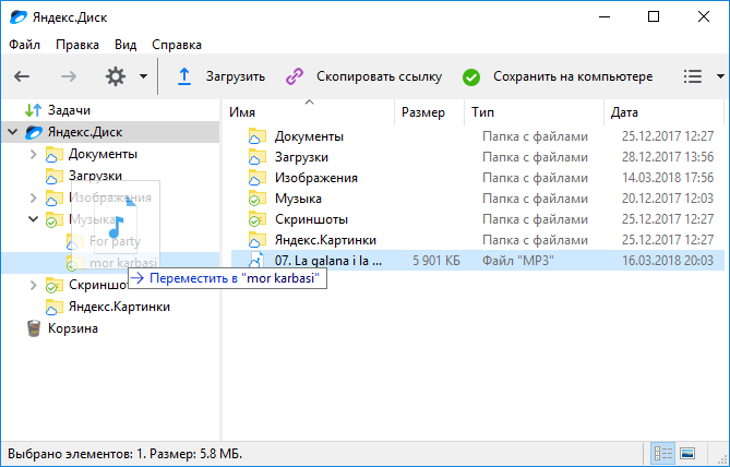 Чтобы переместить объект, перетащите его в нужное место в дереве папок слева. Если вы хотите переместить объект в подпапку, предварительно раскройте ее в дереве.