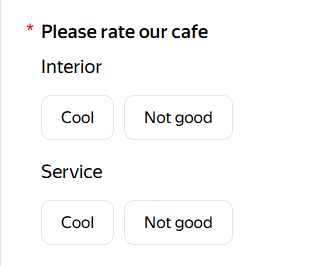 Set the rating scale. The user needs to select an answer option for each criterion. For example, to rate something on a five-point scale, add numbers from 1 to 5 to Answers. Or set three grades: Good, Satisfactory, and Bad.