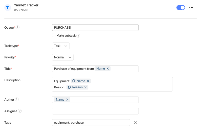 Example of integration with Yandex Tracker for a request form for equipment procurement. Employees can use this form to submit equipment requests, and these requests will be transformed into issues for the procurement department.