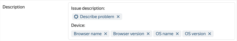 You can set up a form for creating issues and integrate it into the Yandex Tracker interface. This form will be displayed on the issue creation page next to the standard one. It will help users create issues based on a certain template without being distracted by unnecessary fields and parameters. For more information, see Set up issue creation in Yandex Tracker.