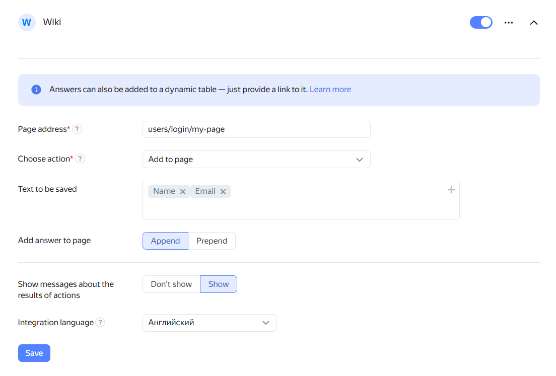In the Text to be saved field, specify what data should be added to the page. You can use YFM markup to format your text. For more information, see HelpWiki.