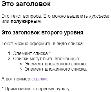 Вы можете добавить элементы форматирования (заголовки, списки, ссылки, курсив и так далее) в тексты вопросов и комментарии к ним, а также в сообщение об отправке формы.