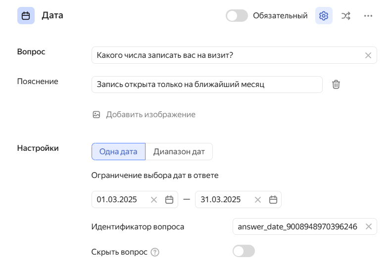 Включите эту опцию, если нужно получить в ответ диапазон дат. Если опция отключена, пользователь может указать только одну дату.