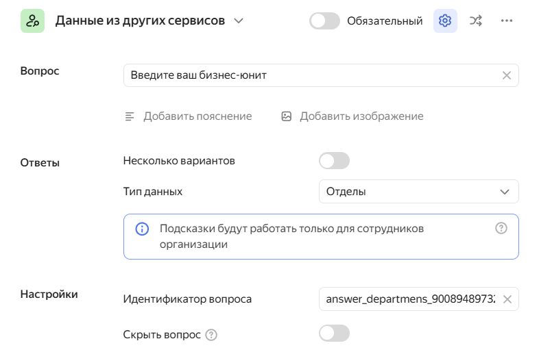 Используйте значение Отделы, чтобы загрузить варианты ответов из организации Яндекс 360 для бизнеса.
