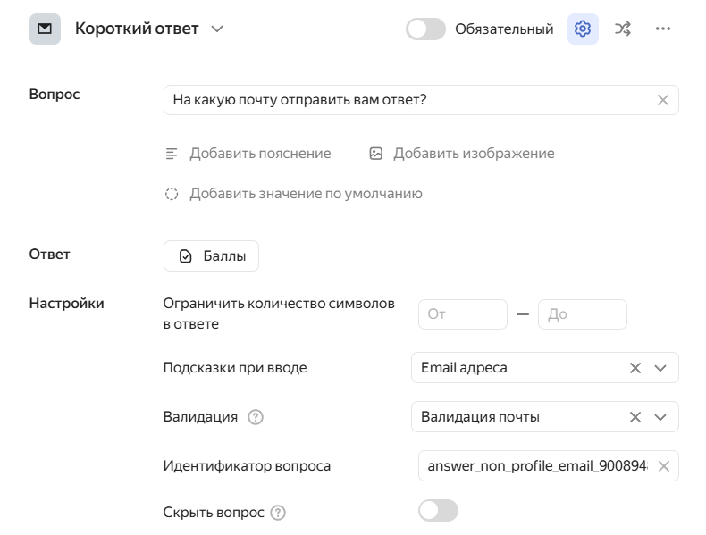 Включите эту опцию, чтобы не отображать вопрос в форме. Скрытые вопросы можно использовать для передачи служебных или вспомогательных параметров.