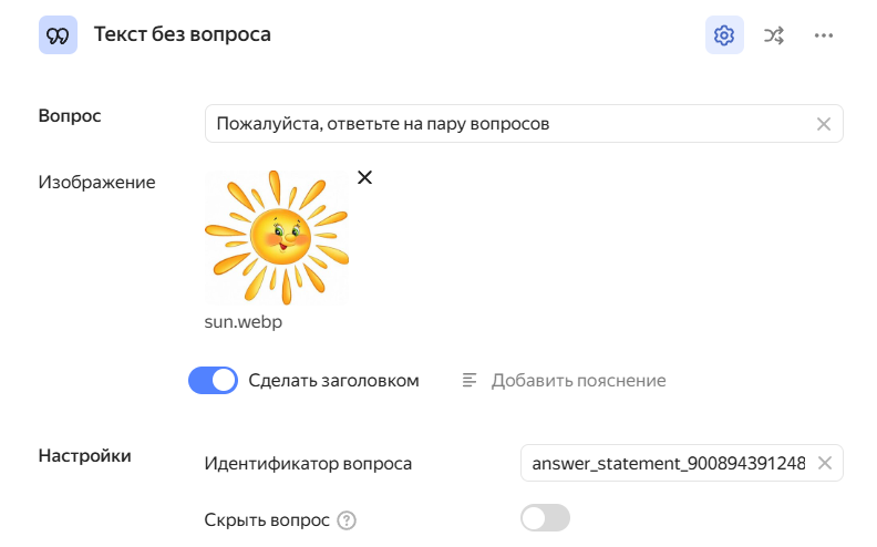 Этот вопрос не требует ответа от пользователя. В него можно добавить произвольный текст, например информацию о форме или заголовок для группы вопросов.