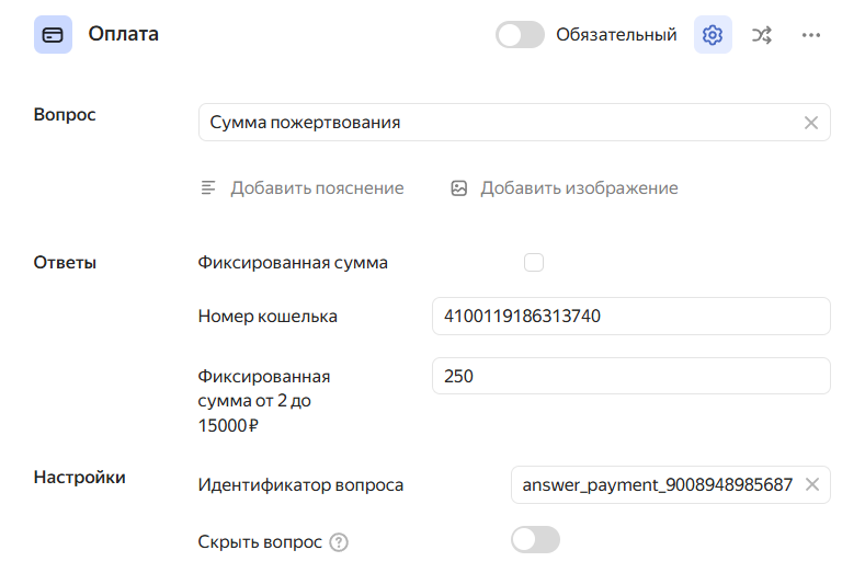 С помощью этого вопроса пользователь может перечислить деньги на кошелек платежной системы ЮMoney (ранее — Яндекс Деньги). Например, взнос за участие в мероприятии.