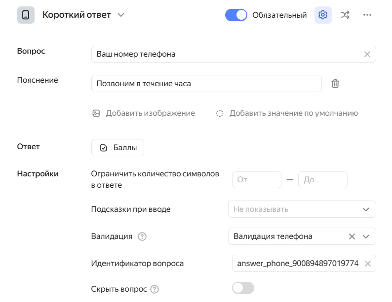Включите эту опцию, чтобы не отображать вопрос в форме. Скрытые вопросы можно использовать для передачи служебных или вспомогательных параметров.