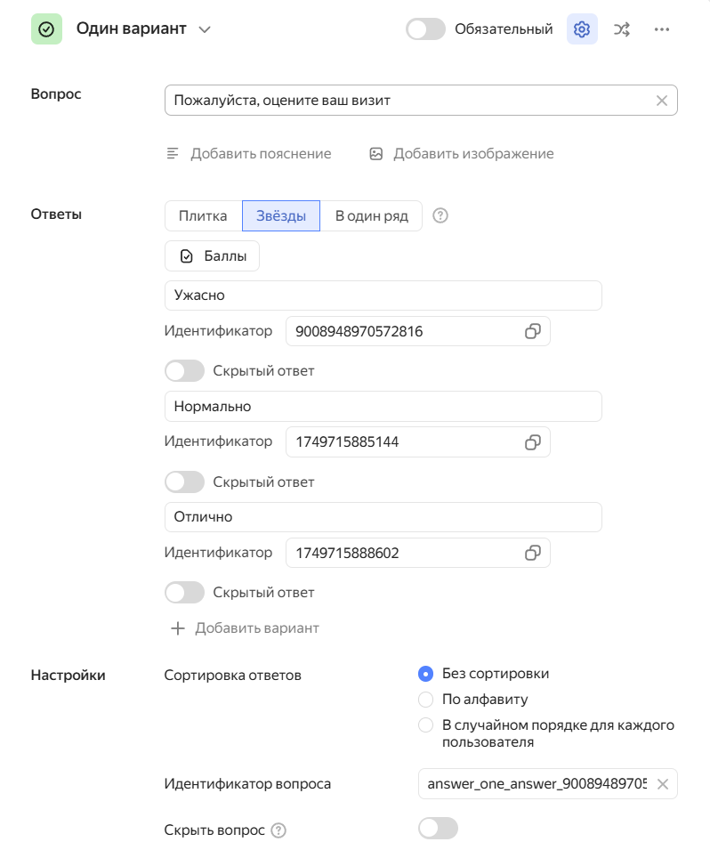 Скрытый ответ. Включите опцию, чтобы временно скрыть вариант ответа, не удаляя его.