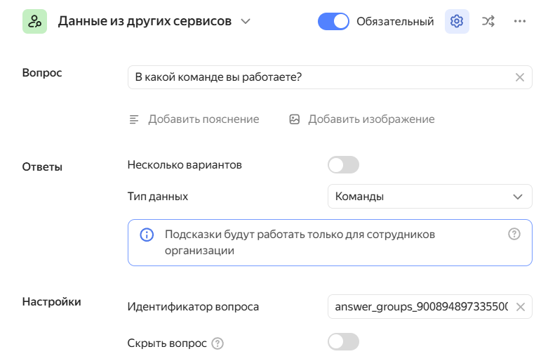 Используйте значение Команды, чтобы загрузить варианты ответов из организации Яндекс 360 для бизнеса.