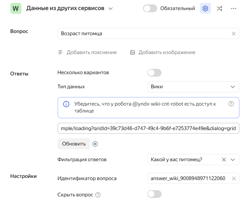 Данные из динамической таблицы Вики обновляются каждые 30 минут, поэтому варианты ответов могут загружаться с задержкой.