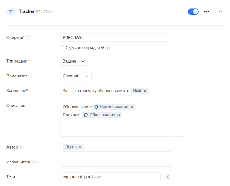 Пример интеграции с Трекером для формы с заявкой на закупку оборудования. С помощью такой формы сотрудники смогут оформлять заявки на оборудование в виде задач для отдела закупок.