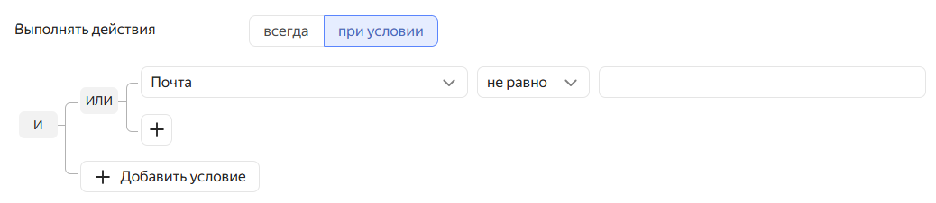 Новое условие будет сгруппировано с предыдущими, по умолчанию ко всем условиям в группе применяется оператор И — действие будет запущено, если все условия выполняются одновременно. Чтобы запускать действие при выполнении хотя бы одного условия, нажмите значок оператора слева от группы, будет выбран оператор ИЛИ.