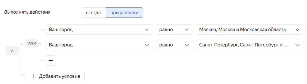 Чтобы задать более сложную логику запуска действия, можно добавить несколько групп условий. Для этого под списком условий нажмите Добавить условие, затем настройте условия в группе и выберите для них логический оператор: И либо ИЛИ.