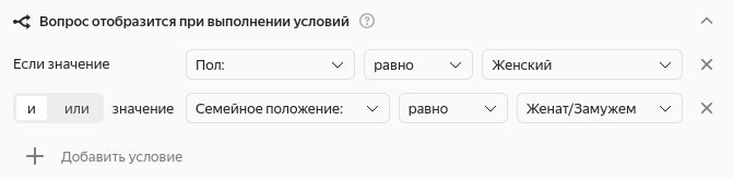 Теперь этот вопрос появится в форме только при условии, что в предыдущих вопросах выбран женский пол и семейное положение — Женат/Замужем.